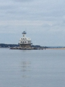 The clouds turned into drizzle by mid-afternoon as we were motor-sailing by Gardiner’s Island. As we passed the “Teapot Lighthouse” at Orient Neck, rain was falling. We picked up a mooring off Orient Yacht Club (just N of Shelter Island) and settled in for the night with a delicious dinner and fireworks emanating from the YC. Soon we could see flashing red lights from emergency vehicles….uh-oh!