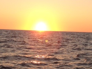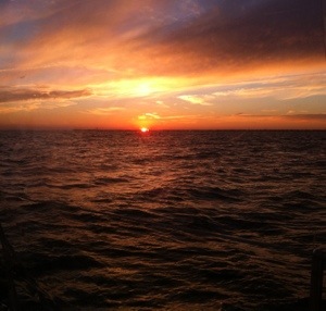 As we did not want to arrive in Atlantic City in the dark we had decided we would go straight to Cape May. Of course I thought about food in advance, so no frills pre-prepared sandwiches and salad was the menu of the day. At about 18:00 a thin line of lights dressed the coastline. Adrien captured a beautiful sunset on watch while I took the first snooze to prepare for our overnight sail.