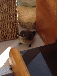 Once the sun rose and warmed the cockpit it became a comfortable morning. In fact, the Captain could be seen on top deck in a bathing suit doing chores! The trip was uneventful until our first feathered guest arrived! A Dark Eyed Junko landed on deck, poked around a bit and then joined us in the cockpit! What a delight to see him up close! Very inquisitive, he hopped around the dash, forward and aft before decided to rest in the sun and warmth of the enclosure. When it was time to go, he unsuccessfully searched for a way out until Adrien guided him in his gentle hand to the opening. He was quite comfortable being photographed up close and very calmly accepted a guiding hand. Junko’s visit our feeders on land all the time but we could never got close enough to take a few pictures much less hold one. What a treat! We had six other visits (Junkos and Black Capped Chickadees) as the afternoon wore on, each as delightful as the last. One even enjoyed hopping into the Mum plant to hang out.