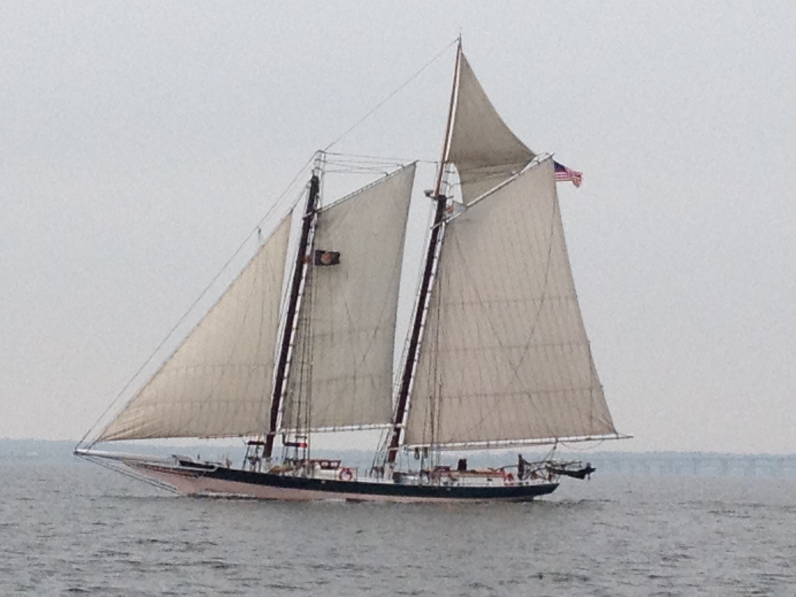 We left the mooring at 09:20 this am…it was hard to get up after all those oysters !…. to cloudy and overcast skies with calm seas. The Chesapeake was deserted except for this tall ship…with a pink hull! I’ve seen Mary Kay pink cady’s, can you earn pink Schooners too?