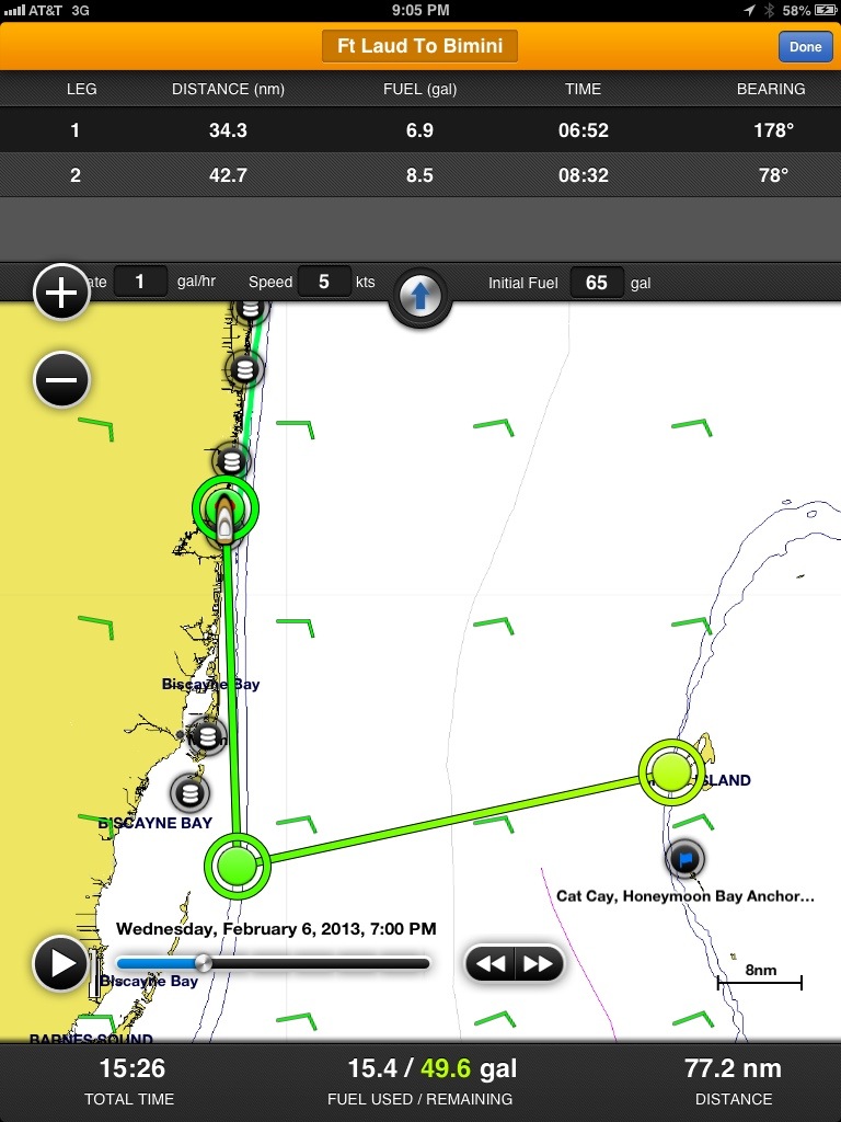 Route from Ft Lauderdale to Bimini, roughly 65 miles. Leaving at midnight allowed us to arrive at Bimini in the morning light to safely navigate the very shallow and poorly marked entrance.